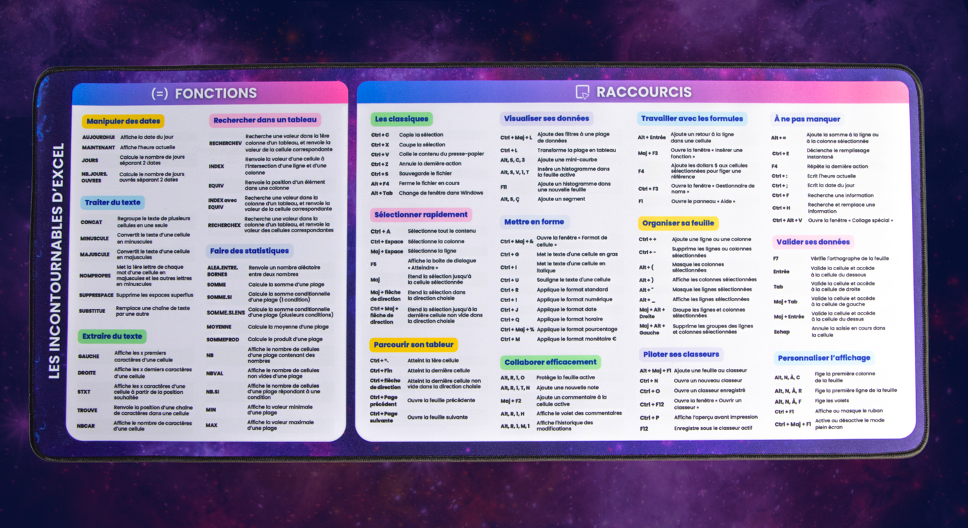 The elegant and practical cheat sheet, designed for Excel users who want to save time and work efficiently.