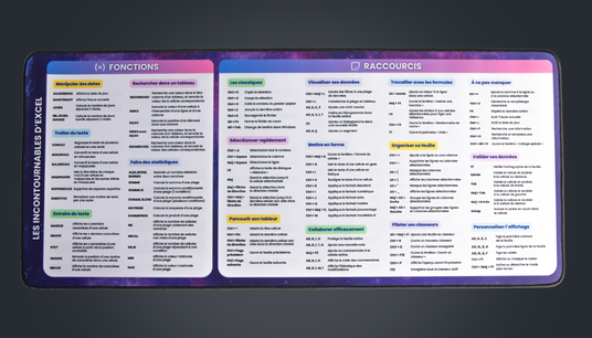 Sa surface a été conçue pour être un véritable aide-mémoire avec tous les raccourcis et fonctions indispensables d’Excel, astucieusement organisés par thématique. Finis les allers-retours sur Internet : tout est là sous tes yeux, prêt à être utilisé 💪